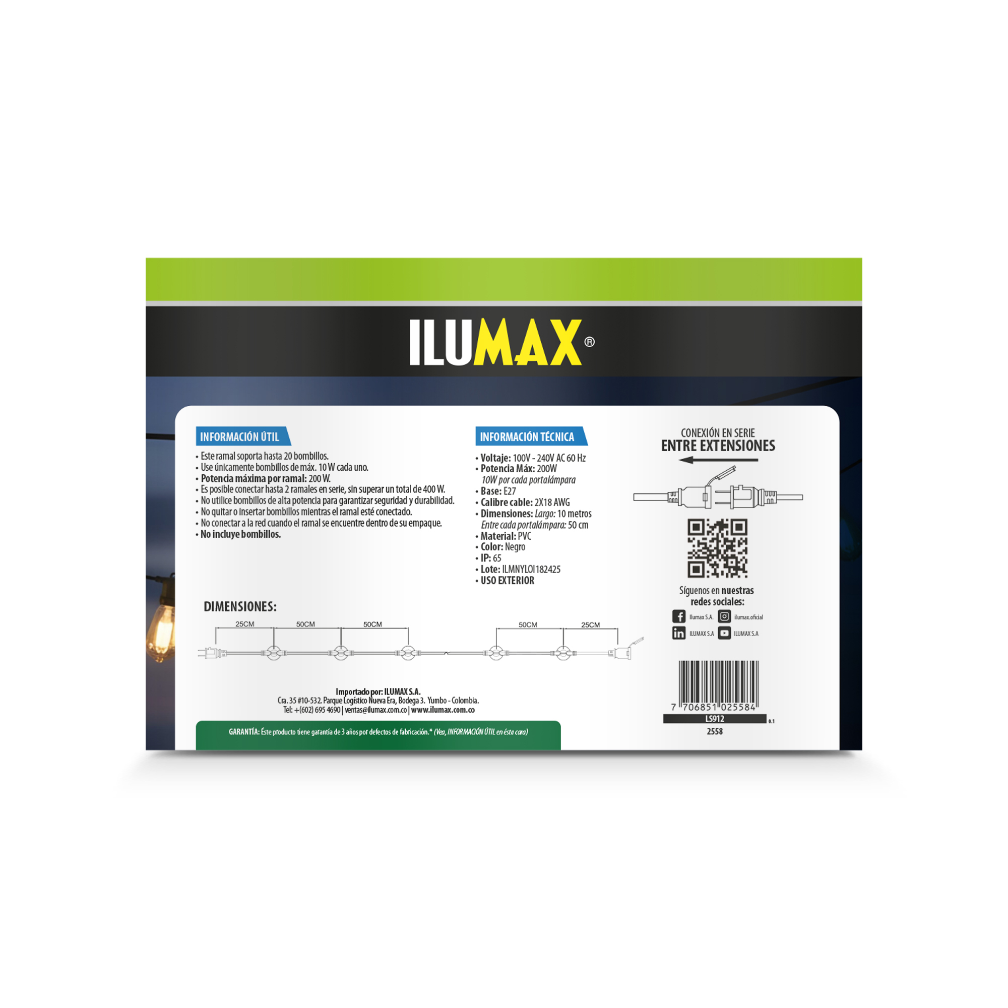 Extensión ramal de 10 metros es ideal para espacios muy tranquilos por sus tipos de luces LED. Para 20 bombillos.